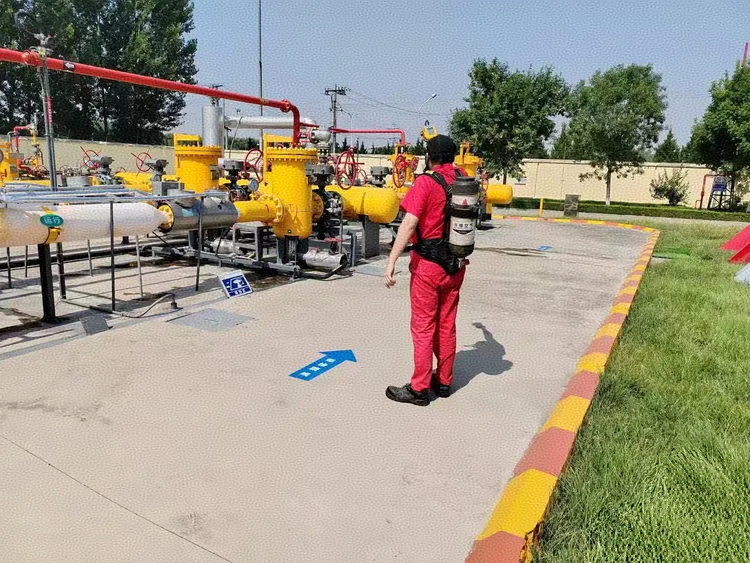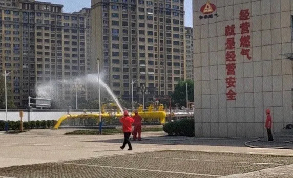 演練指令突然下達(dá)后,公司兩站與泰安老街商業(yè)片區(qū)先后“拉響警報(bào)”。兩站現(xiàn)場(chǎng),值班人員發(fā)現(xiàn)“燃?xì)獯罅啃孤焙螅⒖掏瓿扇藛T疏散和信息上報(bào),調(diào)度室隨即啟動(dòng)Ⅰ級(jí)響應(yīng)實(shí)施遠(yuǎn)程關(guān)閥,站區(qū)值班人員對(duì)進(jìn)站閥門井內(nèi)主控閥門進(jìn)行關(guān)閉。隨后值班人員佩戴正壓式呼吸器、手持檢測(cè)儀,迅速鎖定泄漏點(diǎn),立即啟用消防水帶對(duì)泄漏區(qū)域燃?xì)膺M(jìn)行噴淋稀釋,全過(guò)程一氣呵成,毫無(wú)拖沓。