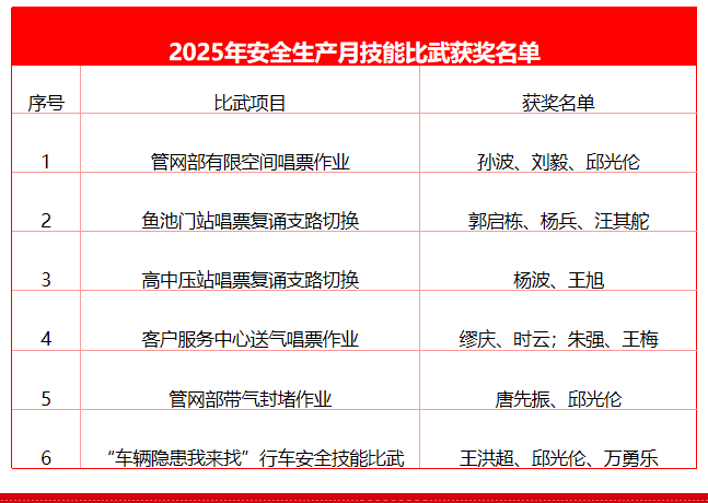 公司圍繞行車安全與燃氣生產(chǎn)運營,開展多樣化比武活動。生產(chǎn)運營方面,管網(wǎng)部、魚池門站、高中壓站及客戶服務(wù)中心分別開展了閥門井有限空間作業(yè)、支路切換、送氣安全操作唱票、封堵作業(yè)等比武活動,以實戰(zhàn)化強化“唱票復(fù)誦”機制,切實提升一線人員規(guī)范操作水平。后勤保障方面,通過舉辦“車輛隱患我來找”行車安全技能比武,將安全規(guī)范融入操作細節(jié),讓應(yīng)急能力在競技中淬煉升華。