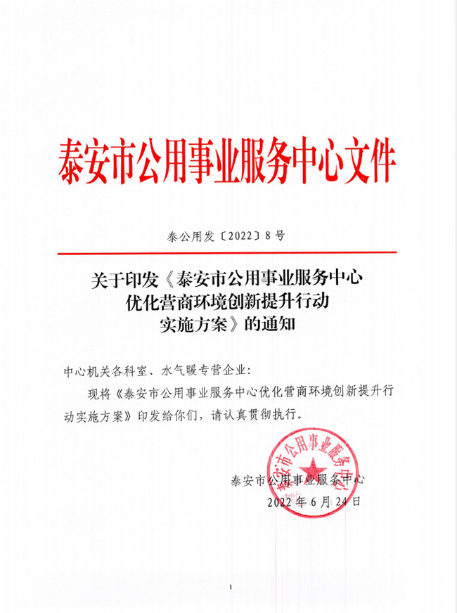 關(guān)于印發(fā)《泰安市公用事業(yè)服務(wù)中心優(yōu)化營(yíng)商環(huán)境創(chuàng)新提升行動(dòng)實(shí)施方案》的通知