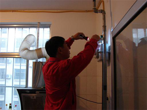 工作人員對(duì)燃?xì)獗斫涌谔帣z漏