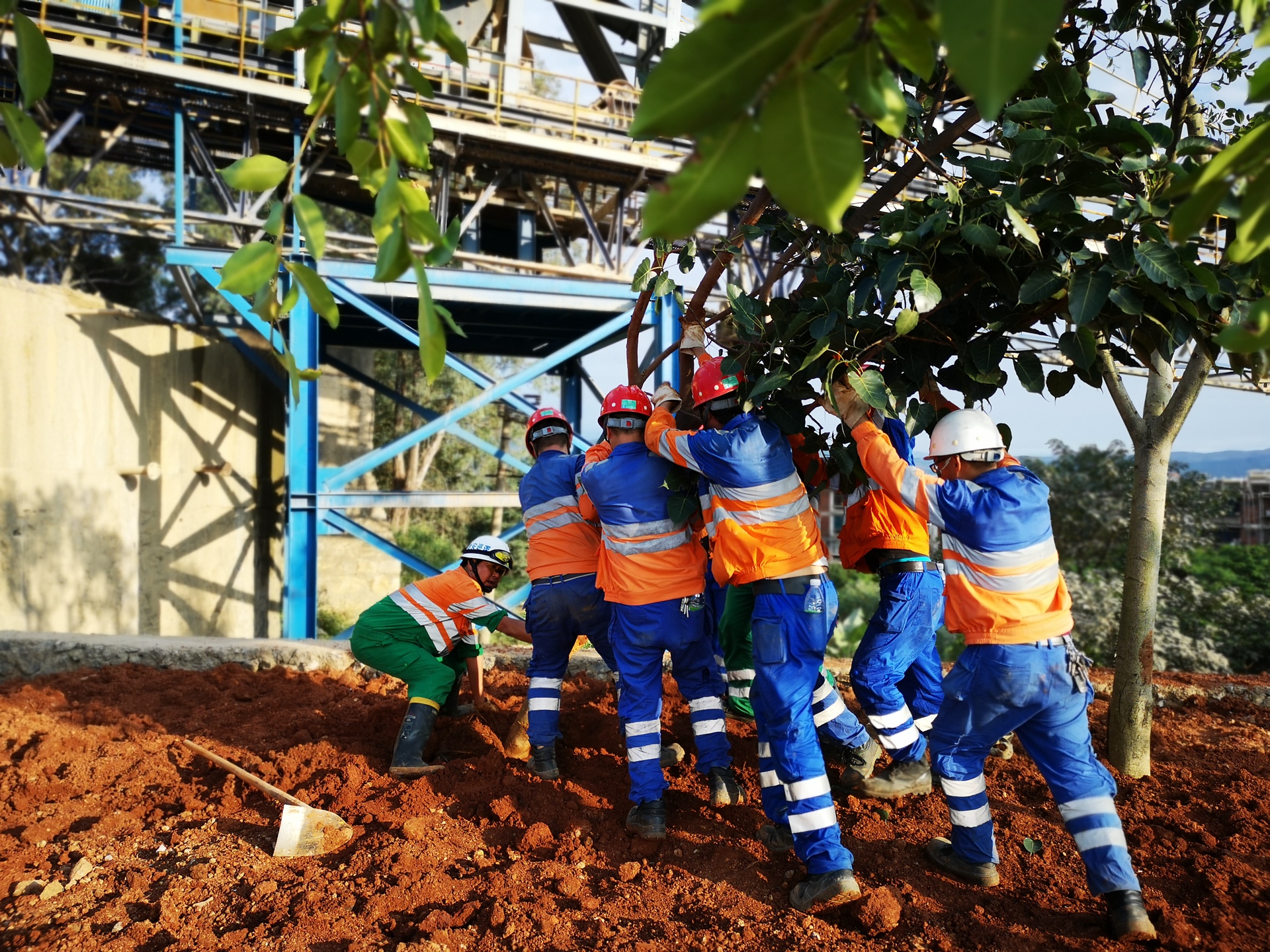 參加礦山中爆破的員工在烈日下“消暑”