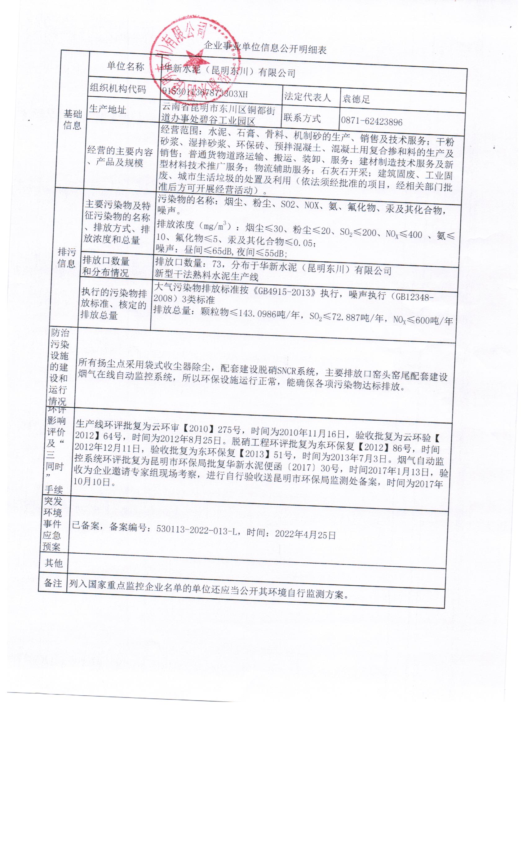 1、華新水泥(昆明東川)有限公司環(huán)境信息公示明細表
