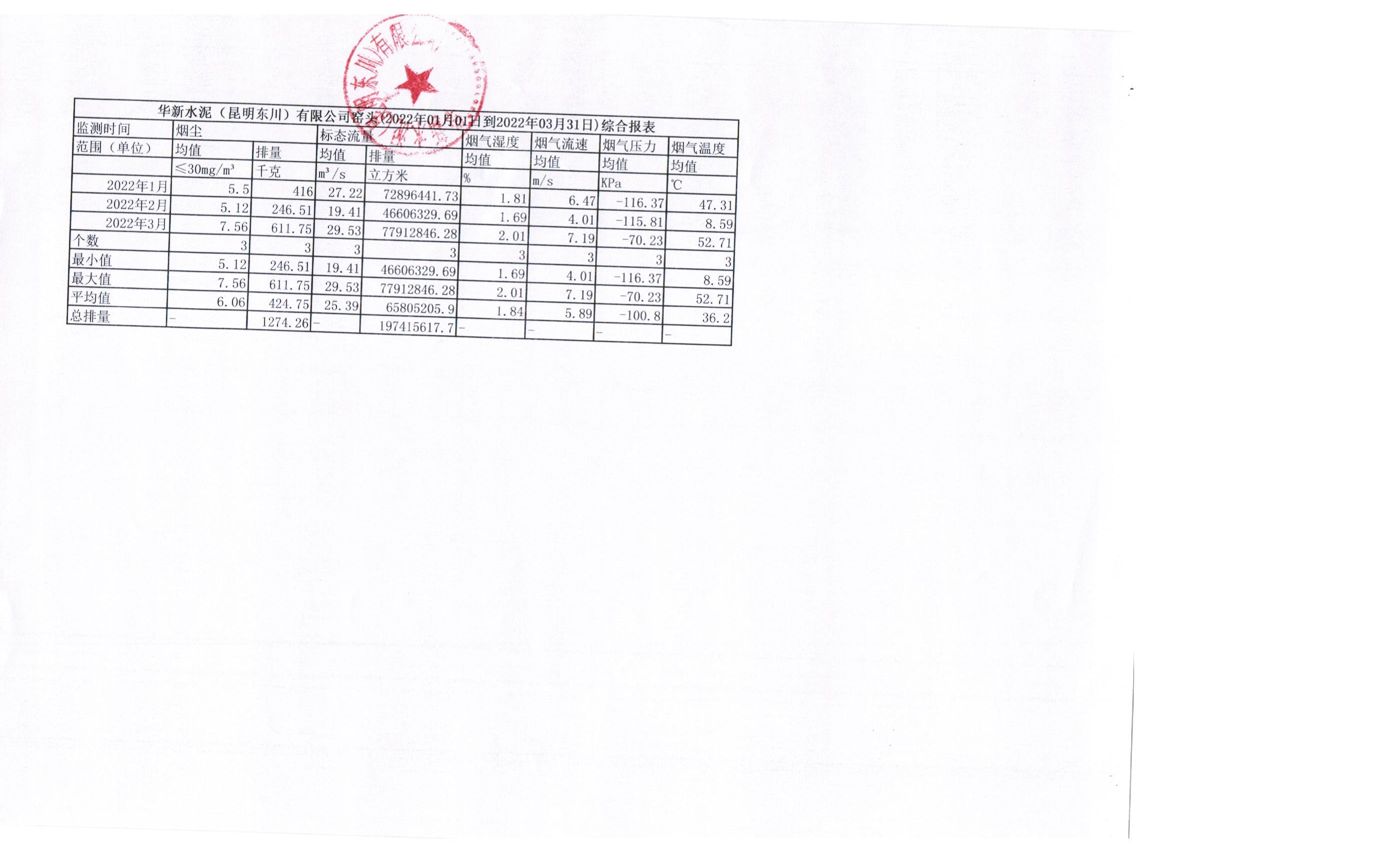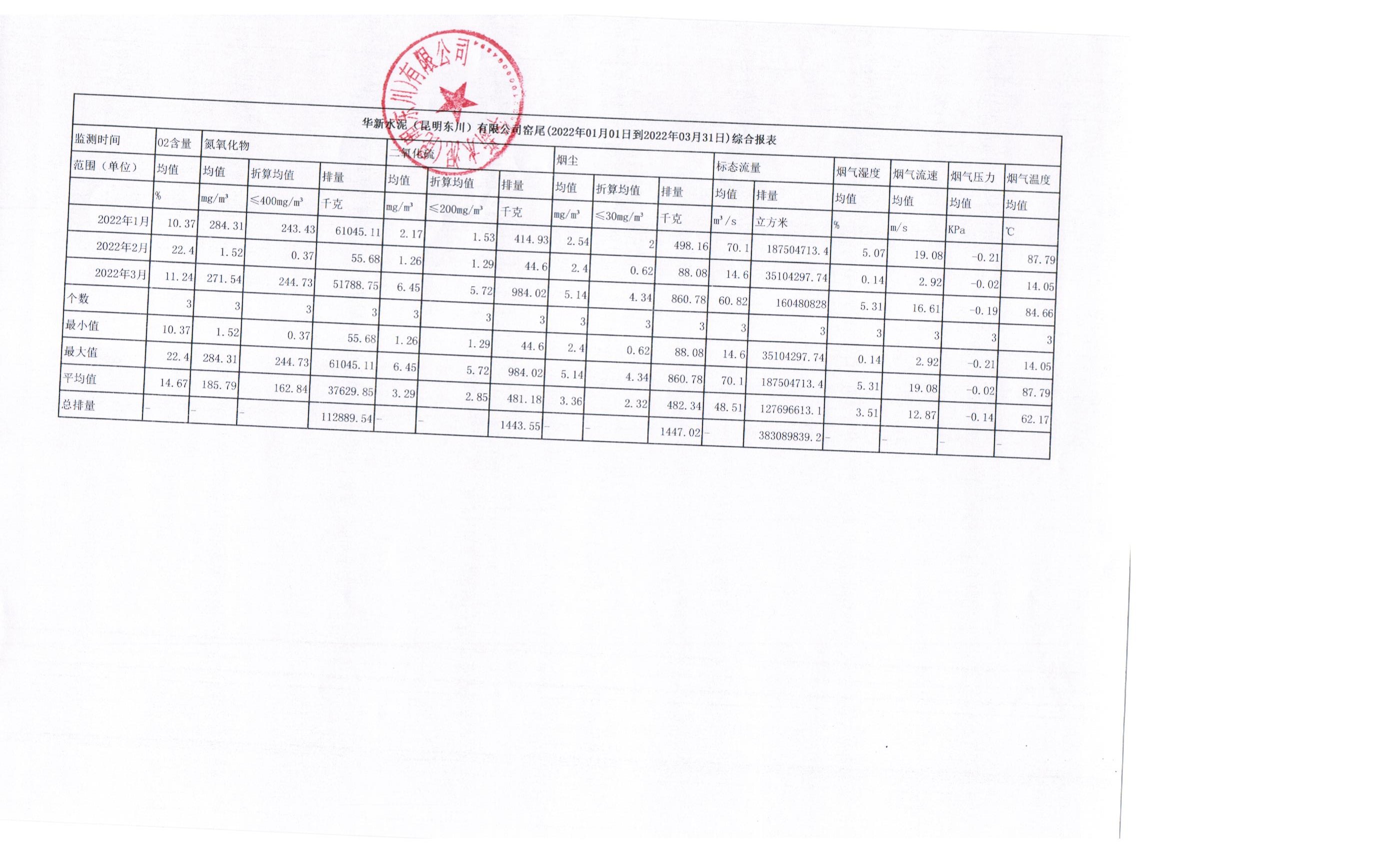 3、華新水泥(昆明東川)有限公司2022年第一季度窯頭煙氣在線監(jiān)測月平均值季報表