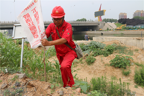 讓巡線員最不放心的,就是隨處可見的施工工地。盡管他們會與工地方主動聯(lián)系,給施工方提供燃?xì)夤艿牢恢?、走向及埋深,并在現(xiàn)場監(jiān)護,但是總有一些施工單位不重視,私自開挖、野蠻施工,這也是導(dǎo)致天然氣泄漏的主要原因。在泮河河道改造現(xiàn)場,由于現(xiàn)場開挖涉及燃?xì)夤艿腊踩?,宋緒全對管道上方做警示標(biāo)識,并一再叮囑現(xiàn)場施工管理人員,尤其挖掘機司機注意管道安全,防止施工機械對燃?xì)夤艿涝斐蓳p壞。因各類施工繁多,巡線的工作重心就側(cè)重于施工現(xiàn)場巡查及監(jiān)護,“白加黑,五加二”的模式,在他眼中看來是再尋常不過的事。從去年開始,他們還專門對警示樁進行了補栽。